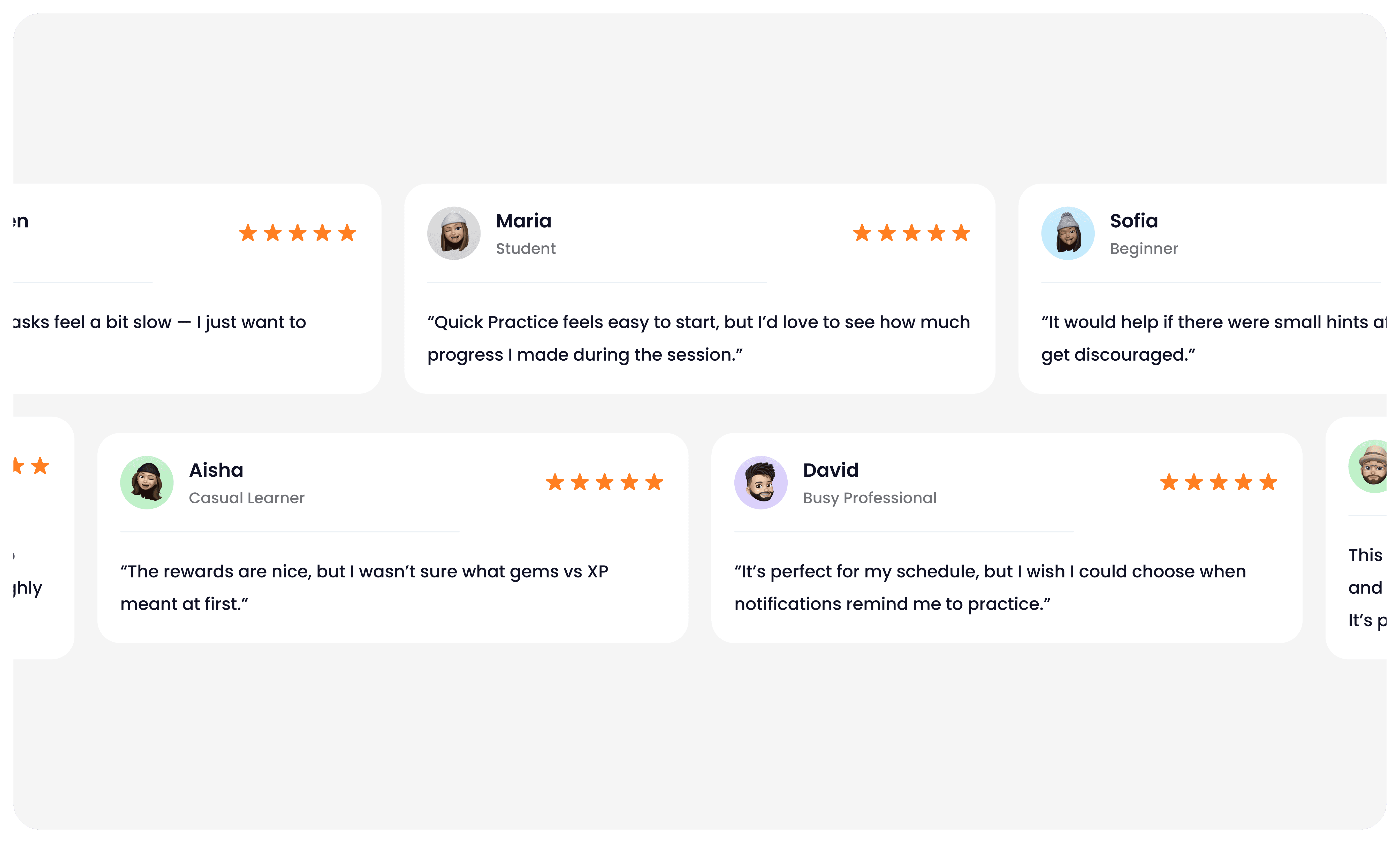 After reviewing the high-fidelity prototype of Quick Practice Mode, I gathered qualitative feedback from learners with different goals and experience levels.