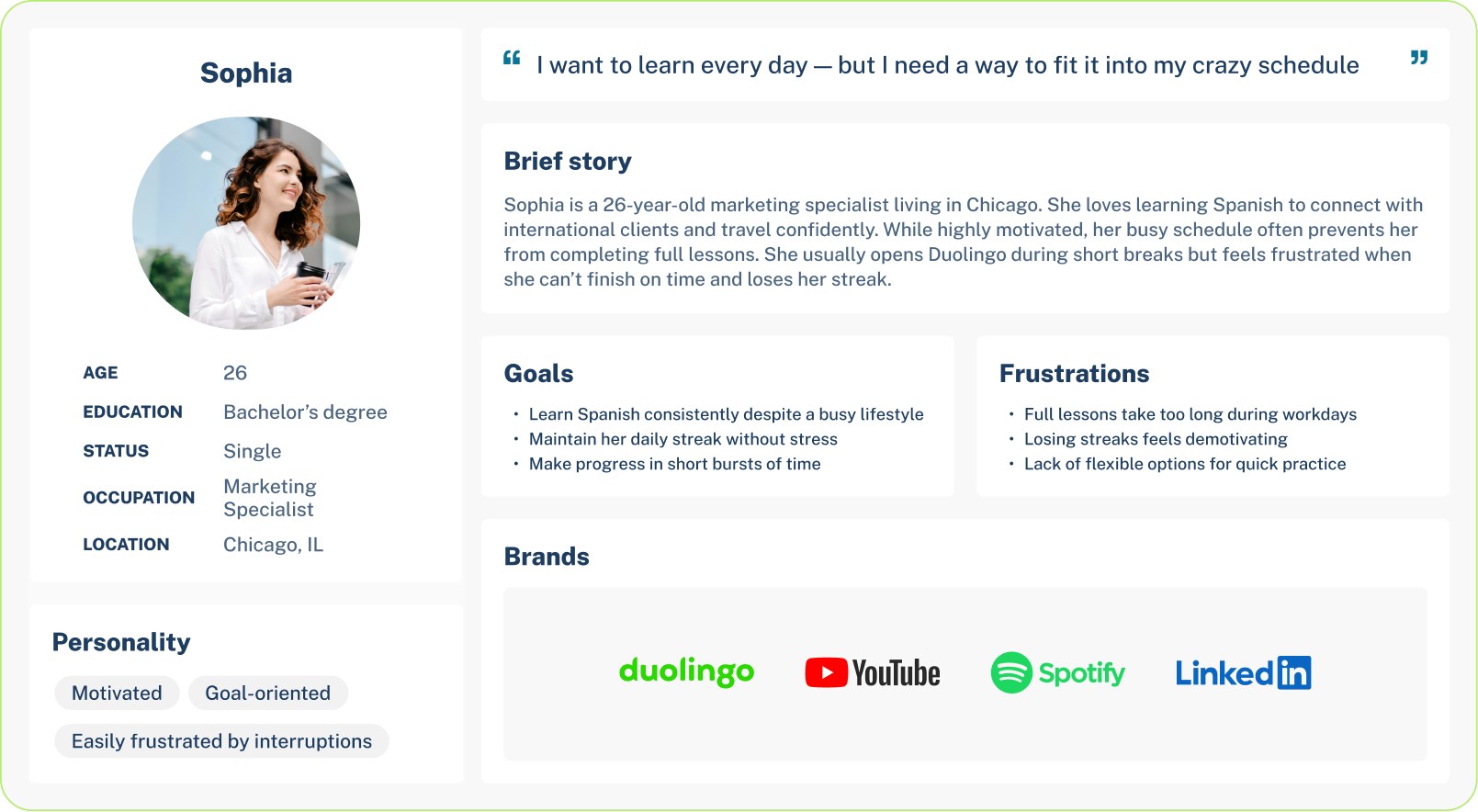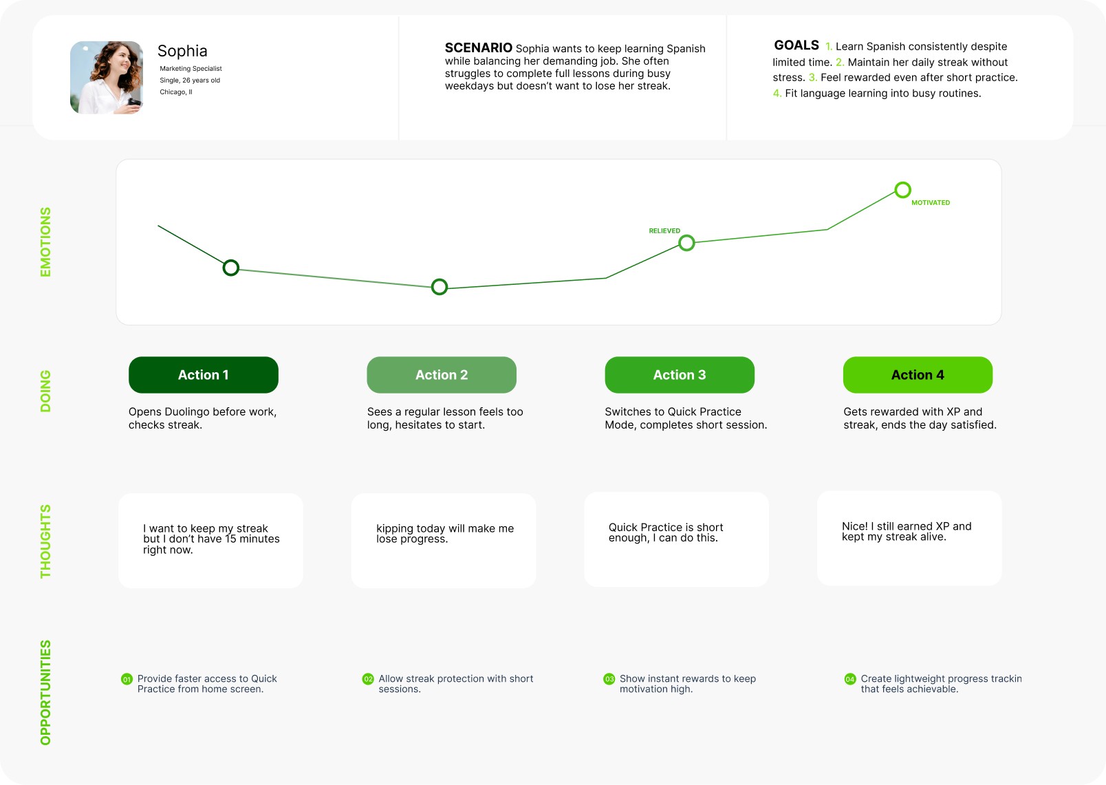 To better understand the challenges learners face, I developed a persona that represents a typical Duolingo user. This persona highlights the daily struggles of balancing language learning with a busy schedule, and shows where frustration often leads to dropped streaks.